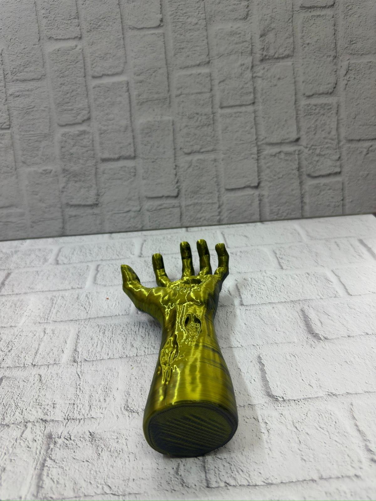 Bu fantastik tasarımlı el heykeli, 22×7 cm boyutlarıyla hem kompakt hem de etkileyici bir dekoratif figür olarak öne çıkar. Ürünün yüzeyindeki damar detayları, parmak kıvrımları ve doğal dokular, heykelin 3 boyutlu etkisini artırır. Özel renk geçişlerine sahip altın–yeşil yüzeyi, ürüne hem modern hem de mistik bir görünüm kazandırmaktadır.El figürü; şans, enerji, yeni başlangıçlar ve yaratıcı güç anlamını taşır. Bu nedenle çalışma masasına, ofis köşesine veya kitaplık rafına yerleştirildiğinde güçlü bir sembolik etki oluşturur. Ürün özellikle fantastik dekor, gotik tarz, modern minimalizm veya konsept tasarım sevenler için ideal bir objedir.Dayanıklı yapısı, uzun süre şekil değiştirmeden kullanılmasına olanak sağlar. Gösterişli görünümü sayesinde hem erkek hem kadın dekor tutkunlarına hediye olarak tercih edilebilir. Koleksiyoncular, sanat severler, fantastik film ve oyun temalı dekorasyon yapanlar için eşsiz bir tamamlayıcı parçadır.