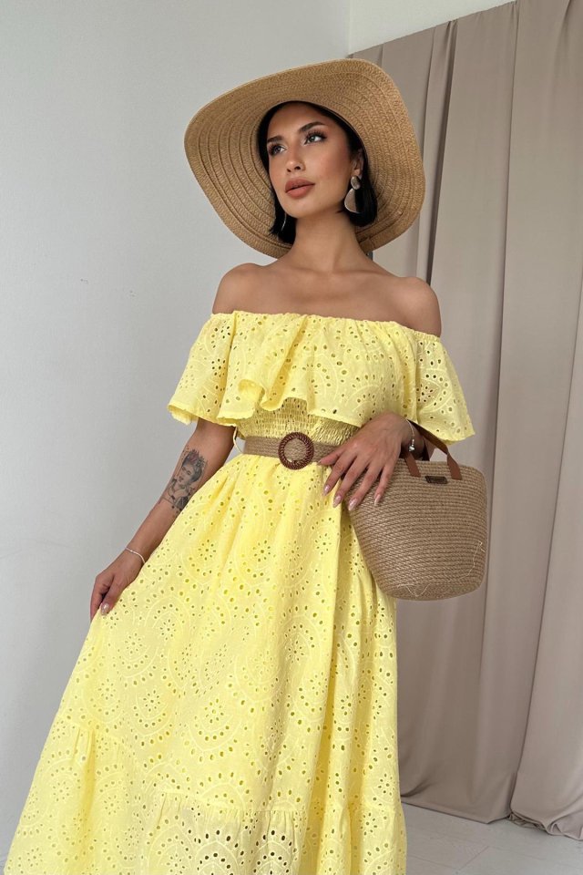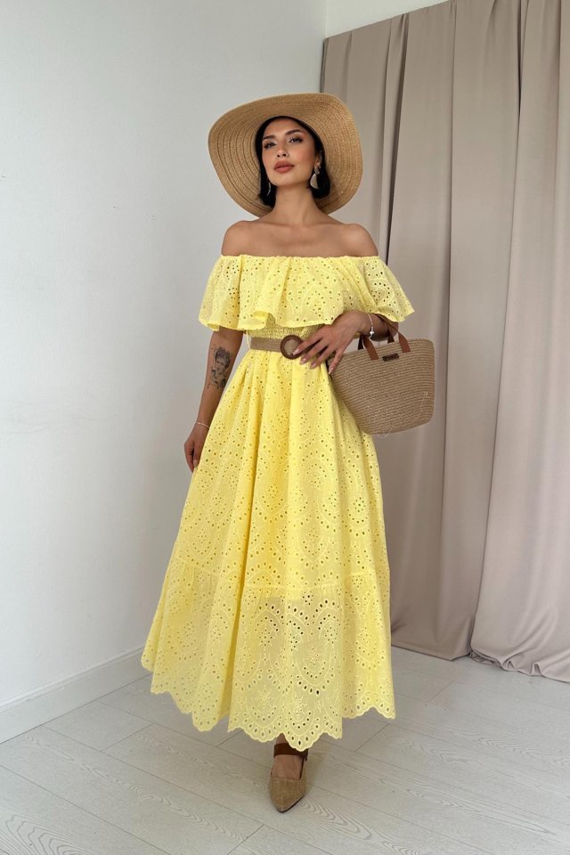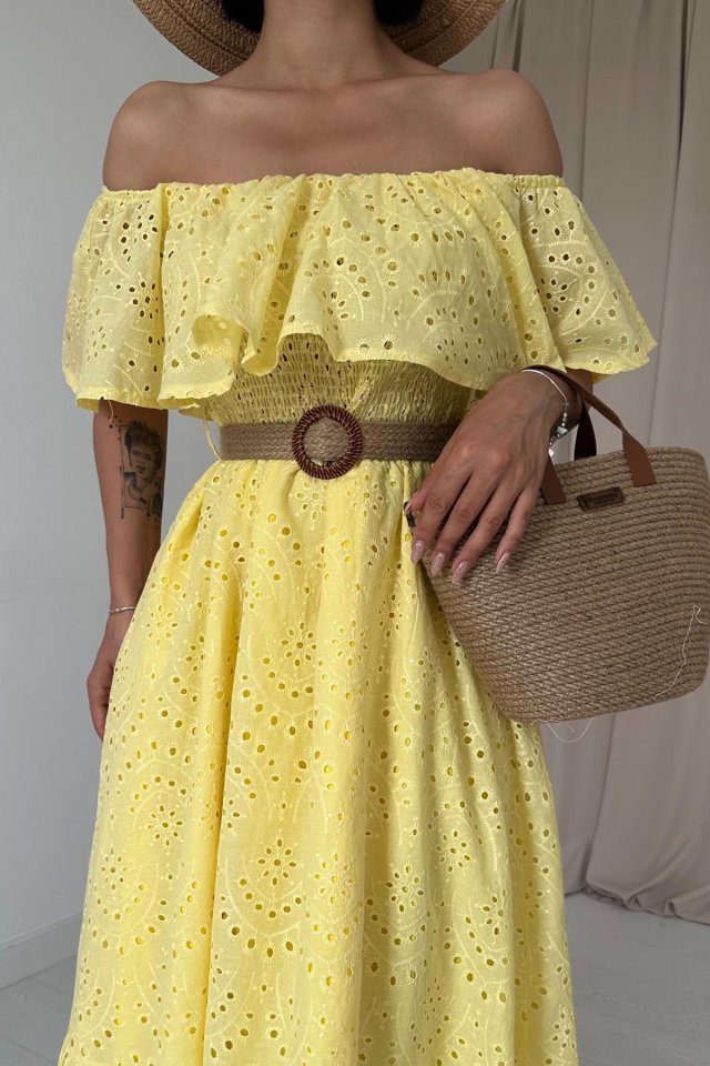 Sarı Omzu Lastikli Brode Elbise