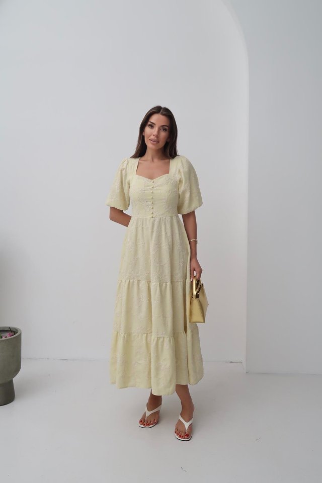 Sarı Süs Düğmeli Balon Kollu Elbise