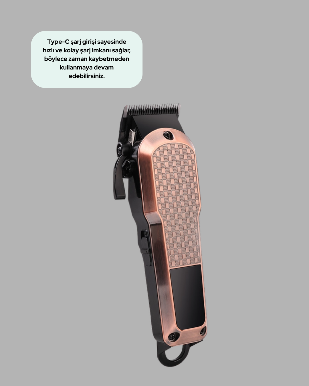 Kişisel bakımda profesyonellik arayanlar için üretilen bu saç kesim makinesi, 7000RPM motor gücü ile üstün performans sunar. Keskin bıçakları sayesinde hızlı, hassas ve çekme yapmadan kesim yapar.Type-C şarj teknolojisi, kısa sürede tam dolum sağlar. LCD ekran, pil durumunu ve çalışma modunu göstererek kontrolü elinizde tutmanızı sağlar. 4 farklı kesim ayarı, her saç tipine ve uzunluğa uygun kullanım imkânı verir.Kuru kullanım özelliği, suya gerek kalmadan pratik tıraş deneyimi sunar. F tipi priz uyumluluğu, uluslararası standartlarda kullanım sağlar. Burun ve kulak temizleme aparatı, kişisel bakımınızı eksiksiz hale getirir.Şarjlı kullanımlarda 3 saate kadar kesintisiz performans sunar. Şık siyah gövdesi, estetik görünümüyle dikkat çeker. Sessiz motor teknolojisi, konforlu kullanım sağlar. Uzun ömürlü bıçakları, dayanıklı gövdesi ve taşınabilir yapısıyla her ortamda yanınızda.