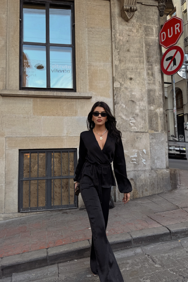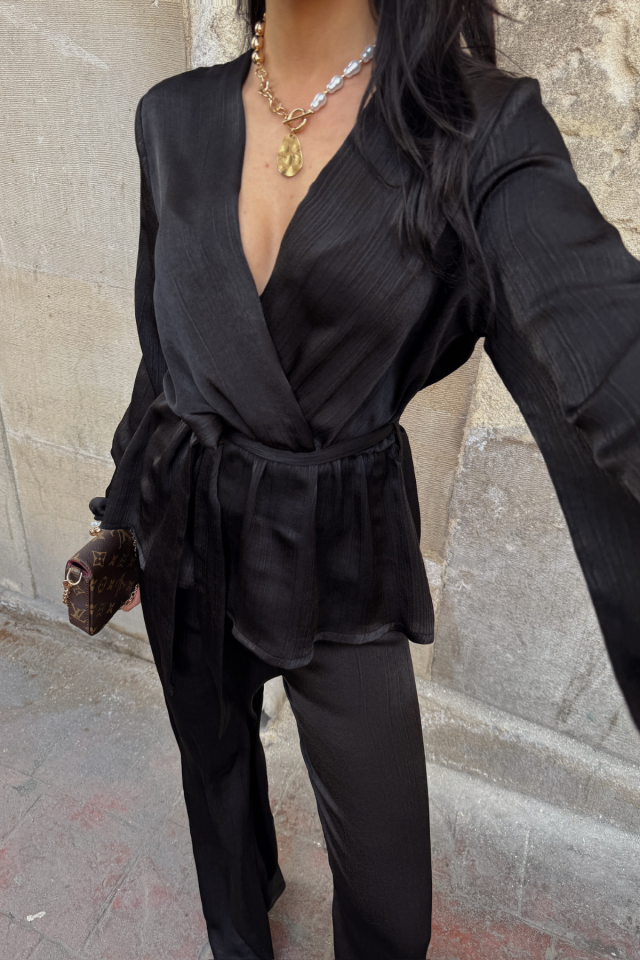 SATEN KRUVAZE BAĞLAMALI BLUZ- PANTOLON TAKIM – Siyah