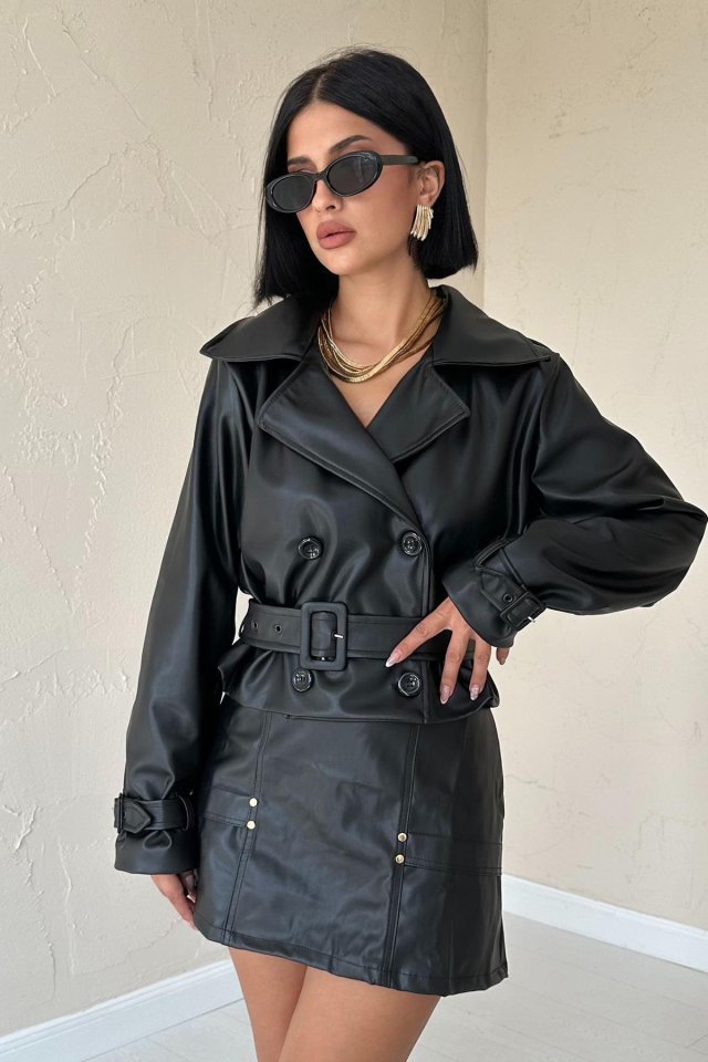 Siyah Kemerli Deri Ceket