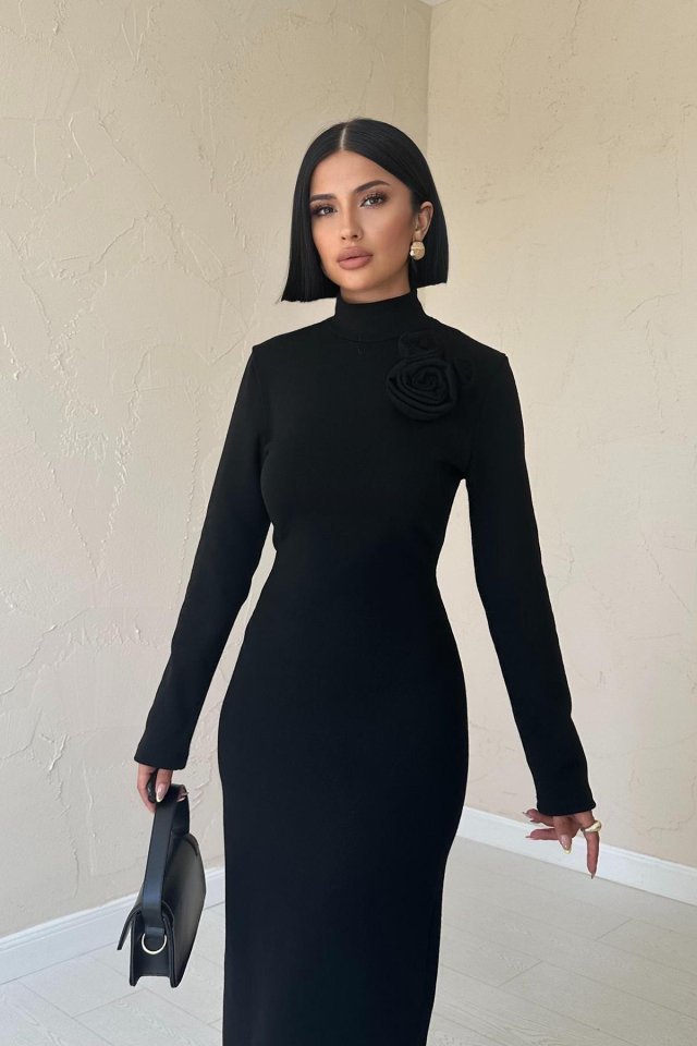 Siyah Omzu Güllü Düz Elbise