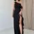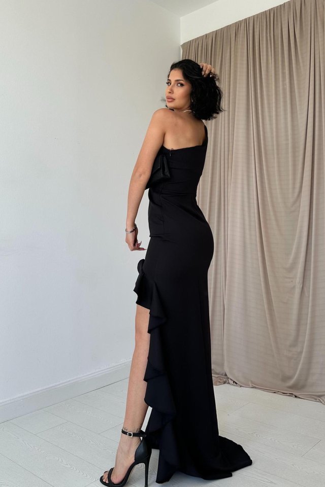 Siyah Yırtmaçlı Volanlı Elbise