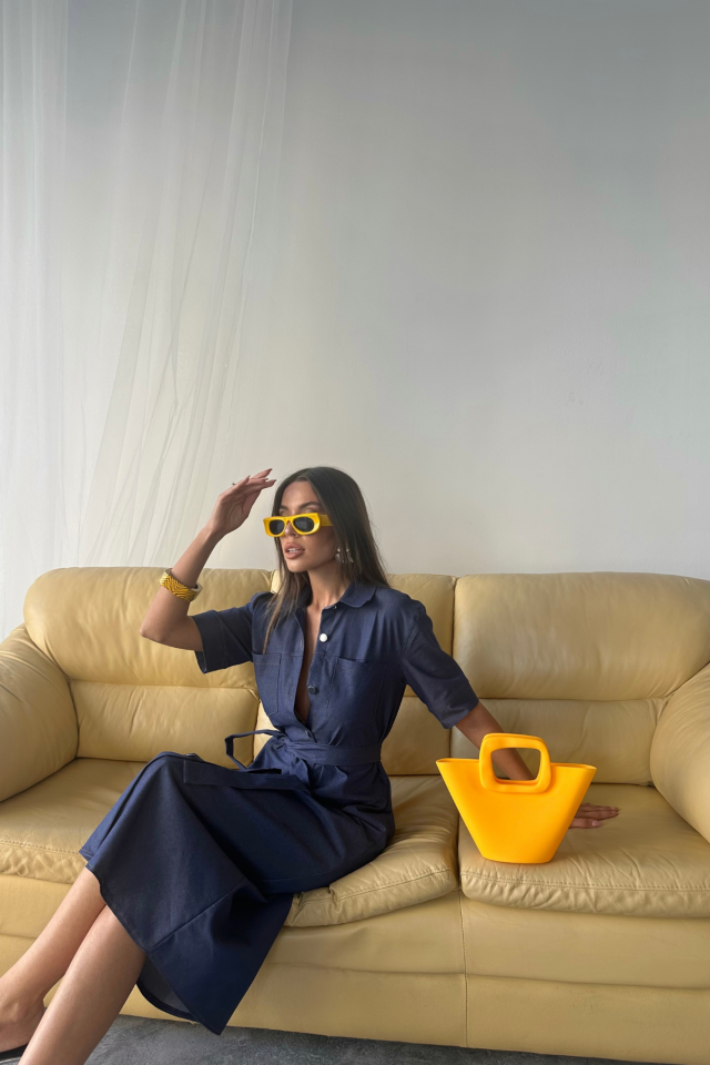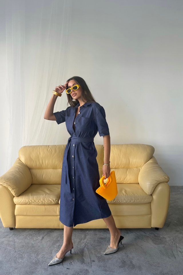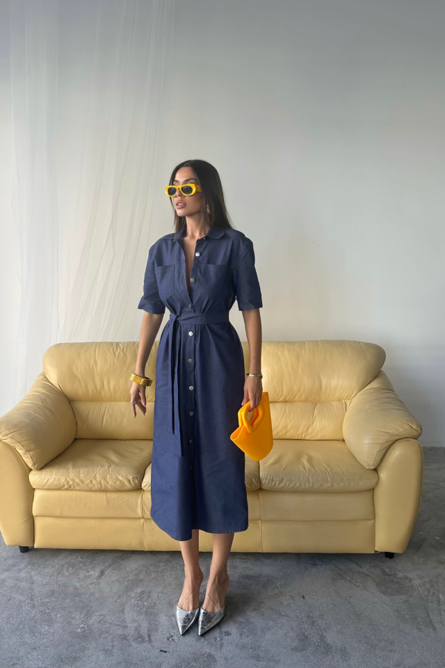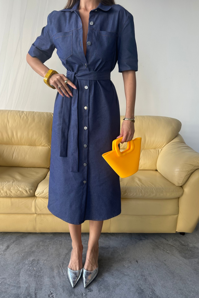 TENCEL ÖNDEN DÜĞMELİ KISA KOL ELBİSE – Mavi