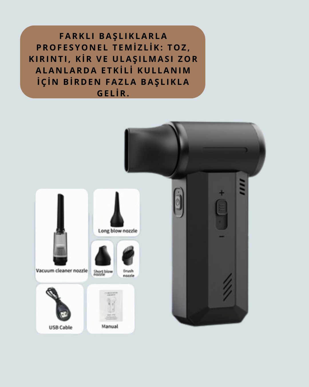 Güçlü hava üfleme ve vakum özelliğine sahip bu çok fonksiyonlu cihaz, ev, araç ve ofis temizliğinde büyük kolaylık sağlar. 130000 RPM’e kadar çıkan yüksek hızlı motoru sayesinde klavye arasına kaçan kırıntılardan arabanın köşe bucak tozlarına kadar her türlü detayı kolayca temizler. Şarj edilebilir bataryası uzun süreli kullanım imkânı sunarken, Type-C şarj desteği ile hızlı ve pratik şarj edilebilir. Üç kademeli hız ayarıyla ihtiyaca göre güç seçilebilir. Kompakt tasarımı sayesinde kolay taşınır ve yer kaplamaz. Dayanıklı gövde yapısı uzun ömürlü kullanım için uygundur. Kutusunda farklı başlıklar, şarj kablosu ve kullanım kılavuzu ile birlikte gelir. Hem temizlik hem de yaz aylarında serinleme için kullanılabilecek pratik bir üründür.