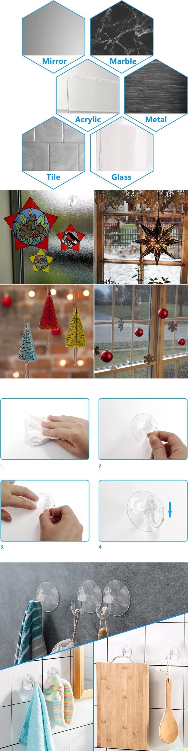 ÇIKARILABİLİR VE YENİDEN KULLANILABİLİR  Emme kancaları, güçlü taşıma kapasitesi ve yapışma özelliğine sahip, su geçirmez ve uzun hizmet ömrüne sahip yüksek kaliteli silikon/kauçuk malzemeden yapılmıştır. vantuz kancalarımızın çıkarılması kolaydır, iz bırakmaz ve yeniden kullanılabilir.
