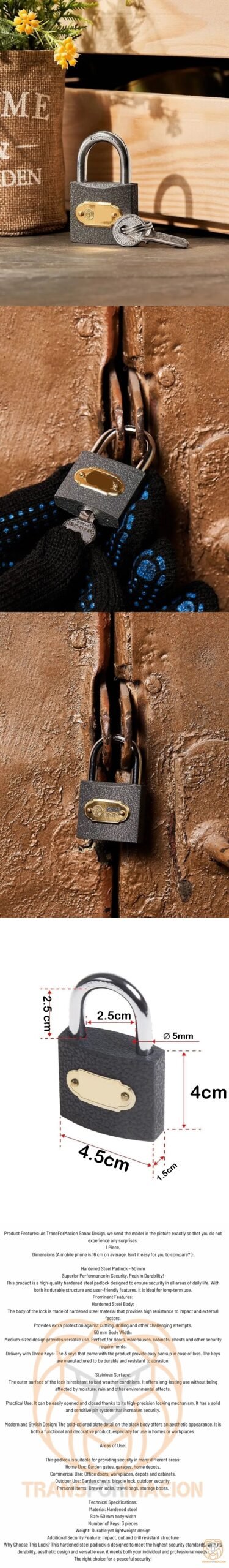 Bu ürün, günlük hayatın her alanında güvenliği sağlamaya yönelik tasarlanmış, yüksek kaliteli bir sertleştirilmiş çelik asma kilittir. Hem dayanıklı yapısı hem de kullanıcı dostu özellikleriyle, uzun süreli kullanım için idealdir.
