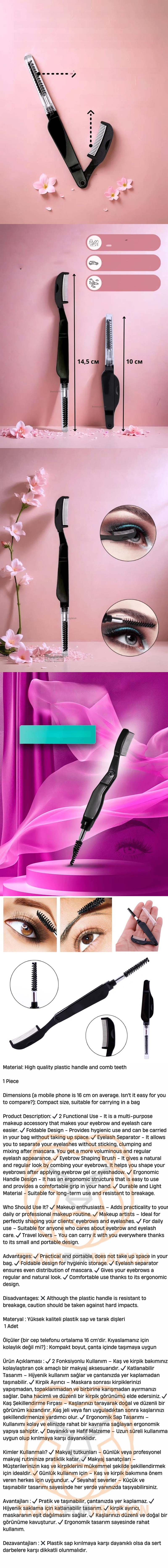 Avantajları : Pratik ve taşınabilir, çantanızda yer kaplamaz. Hijyenik saklama için katlanabilir tasarım.   kirpik ayırıcı, maskaranın eşit dağılmasını sağlar. Kaşlarınızı düzenli ve doğal bir görünüme kavuşturur. Ergonomik tasarım sayesinde rahat kullanım.