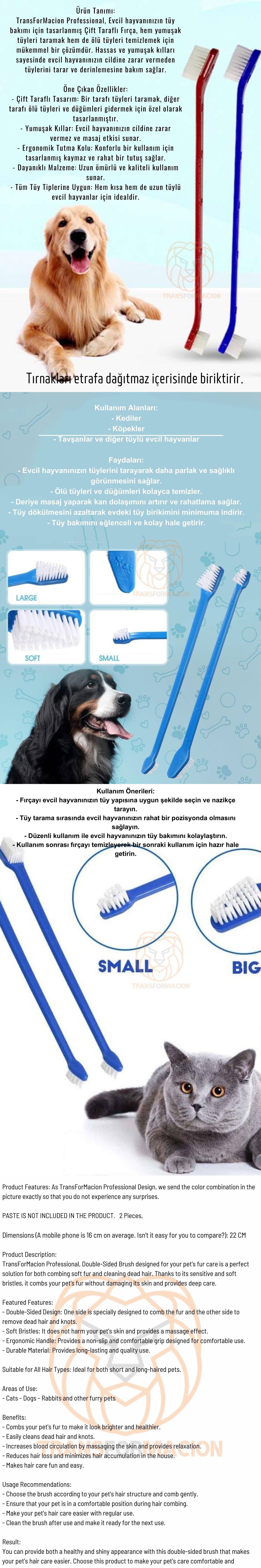 Evcil hayvanınızın tüy bakımını kolaylaştıran bu çift taraflı fırça ile hem sağlıklı hem de parlak bir görünüm sağlayabilirsiniz. Evcil dostunuzun bakımını konforlu ve etkili bir hale getirmek için bu ürünü tercih edin!