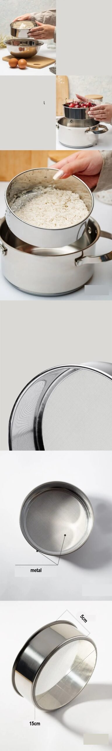 Çerçevesi ve süzgeci %100 çelikten imal edilmiştir. Un ve benzeri malzemeleri elemek için kullanılabilir. Ayrıca tencerelerde yemek yaparken süzgeç amaçlı da kullanılabilir