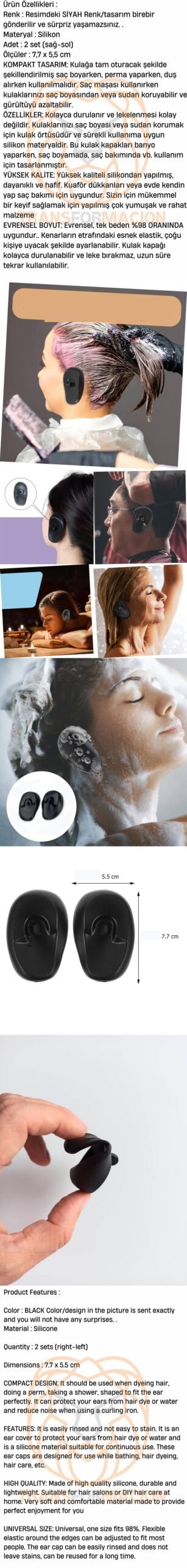ÖZELLİKLER: Kolayca durulanır ve lekelenmesi kolay değildir. Kulaklarınızı saç boyası veya sudan korumak için kulak örtüsüdür ve sürekli kullanıma uygun silikon materyaldir. Bu kulak kapakları banyo yaparken, saç boyamada, saç bakımında vb. kullanım için tasarlanmıştır.