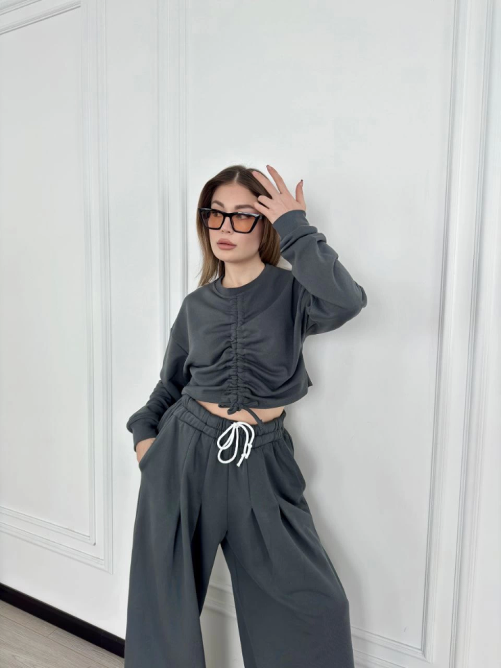 Uzun Kollu Önü İp Büzgülü Crop Ve Pantolon İkili Takım – Antrasit