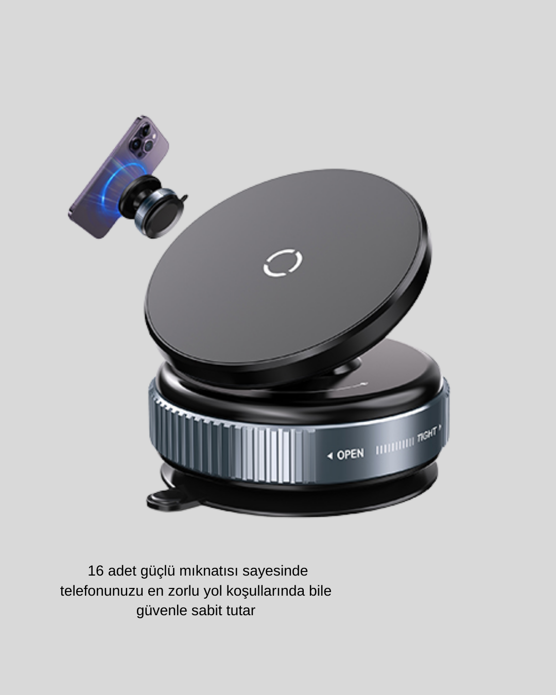 Bu güçlü manyetik telefon tutucu, yenilikçi vakum adsorpsiyon teknolojisi ve N52 sınıfı mıknatısıyla modern kullanıcıların hem güvenlik hem de konfor beklentilerine yönelik olarak tasarlanmıştır. Ürün, klasik vantuzlu tutuculardan çok daha farklı bir yapıya sahiptir; elektrik gerektirmez, yalnızca tek bir çevirme hareketiyle aktifleşen vakum sistemi sayesinde cam, araç önü, konsol veya düz yüzeylere saniyeler içinde sabitlenebilir. Bu mekanizma, yüzeyde iz bırakmadan güçlü bir tutuş sağlar. Deri veya ahşap gibi pürüzlü yüzeylerde kullanılmaya uygun olmasa da tüm düz yüzeylerde mükemmel performans sunar.Tutucunun merkezinde yer alan halkasal N52 mıknatıs, günümüzde kullanılan en güçlü mıknatıs tiplerinden biridir ve 35.27 oz seviyesinde manyetik tutuş gücü sunar. Bu güç, zorlu yol koşullarında dahi telefonu sabit tutar. Ani frenler, sert virajlar veya titreşimli yollar cihazın kaymasına engel olur. Ürün 8000’den fazla kullanım testiyle dayanıklılığını kanıtlamıştır.360 derece dönebilen tasarımı, hem dikey hem yatay kullanım arasında hızlı geçiş yapılmasını sağlar. Araç kullanırken navigasyon moduna, spor yaparken dikey video moduna veya yemek yaparken yatay izleme moduna kolaylıkla geçebilirsiniz. Aynı zamanda içerik üreticileri için TikTok, Instagram, Reels veya canlı yayınlarda mükemmel bir kullanım sunar.iPhone 12, 13, 14, 15, 16 serileri ile tam uyumludur. Mıknatıssız telefon ya da kılıf kullananlar için metal halka pakete dahil edilmiştir. Metal halkayı cihazınıza yapıştırıp 24 saat beklettiğinizde en yüksek yapışma gücüne ulaşır.Evde, arabada, banyoda, mutfakta veya spor alanlarında güvenle kullanabileceğiniz bu çok yönlü tutucu, telefon kullanımını hem pratik hem de güvenli hale getirir.