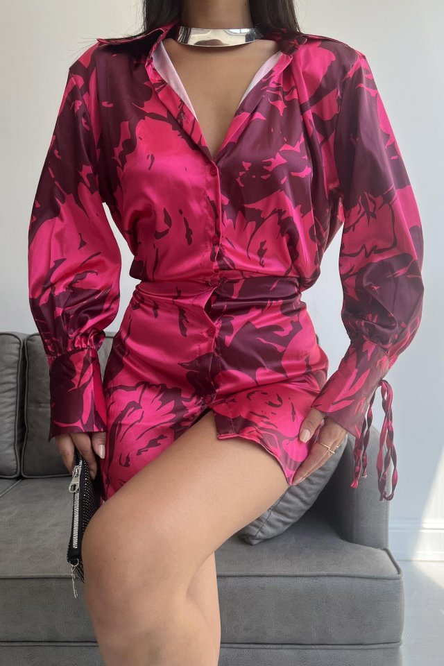 Vatkalı Manşet Detaylı Gömlek Elbise – Fuşya