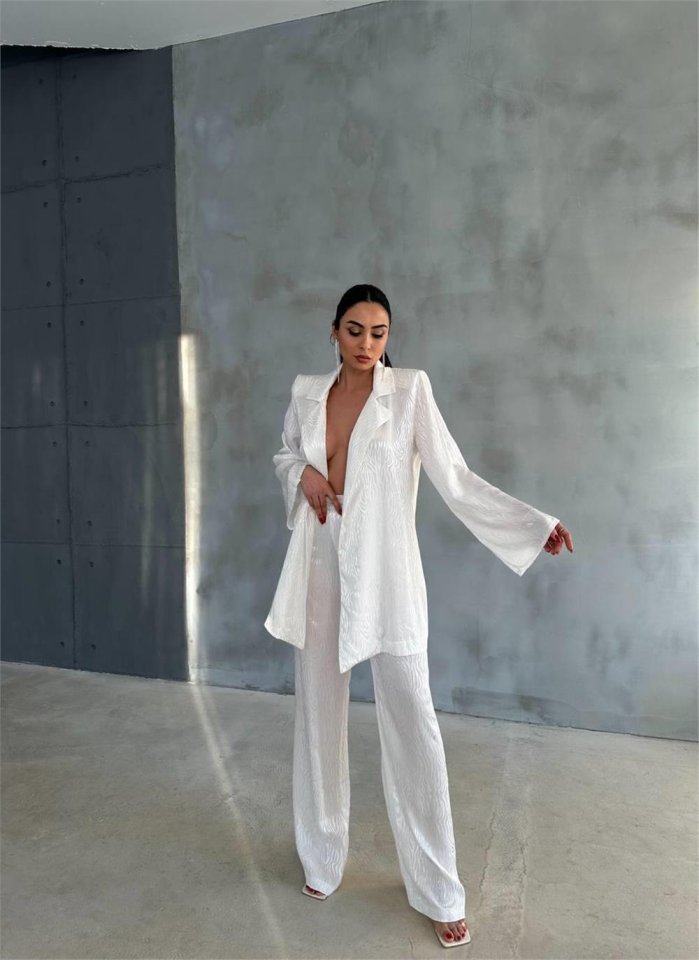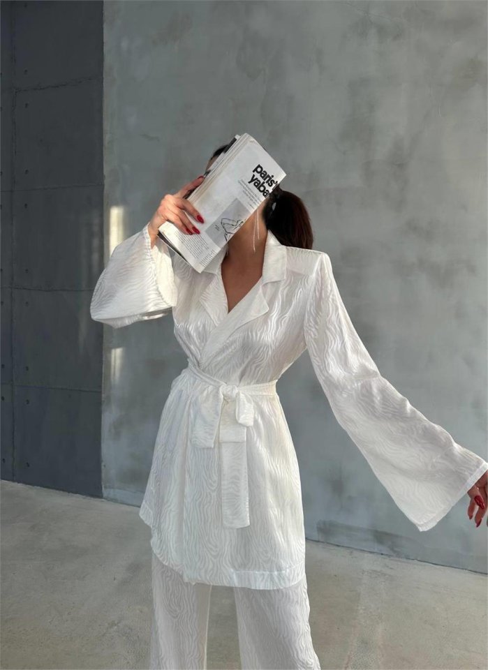 VİSKON JAKARLI BAĞLAMALI GÖMLEK – PANTOLON TAKIM – Beyaz