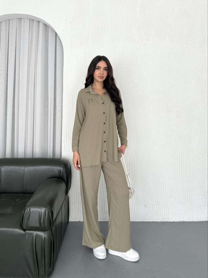 Yakalı Düğmeli Uzun Kollu Gömlek Pantolon Ikili Takım – Bej