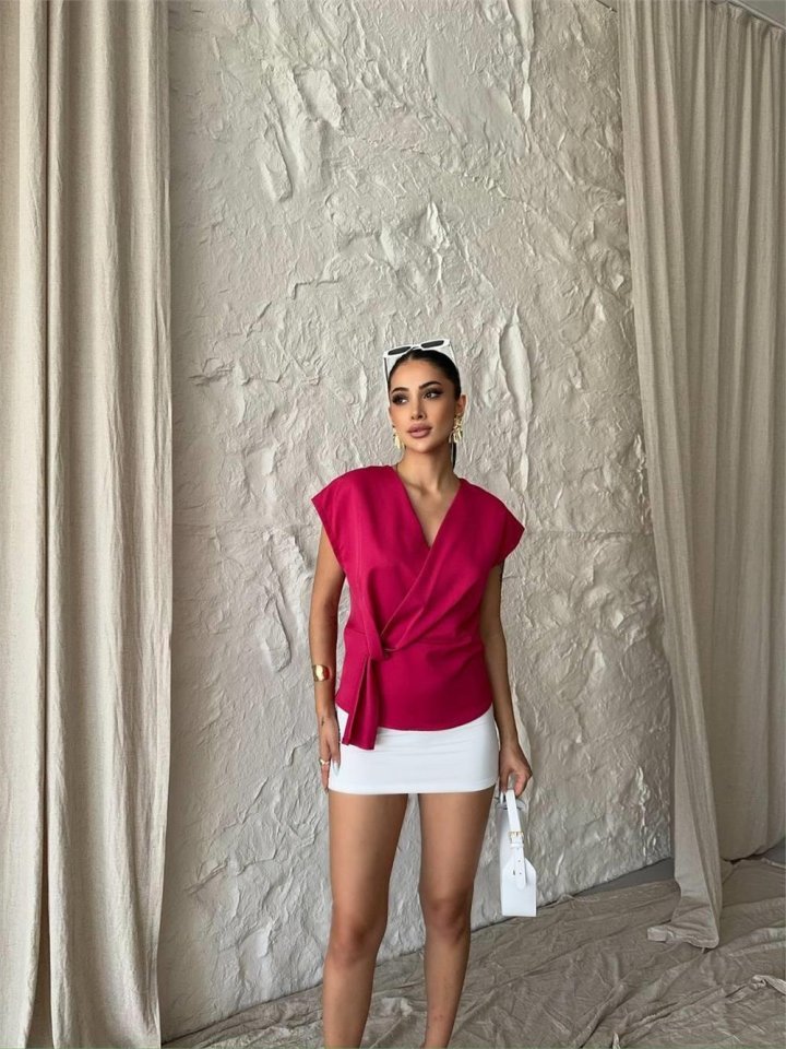 YANDAN BAĞLAMA DETAYLI KOLSUZ BLUZ – Fuşya