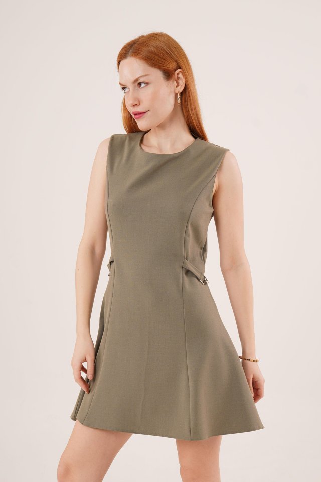 Yanları Zincir Detaylı Sıfır Kol Haki Mini Elbise