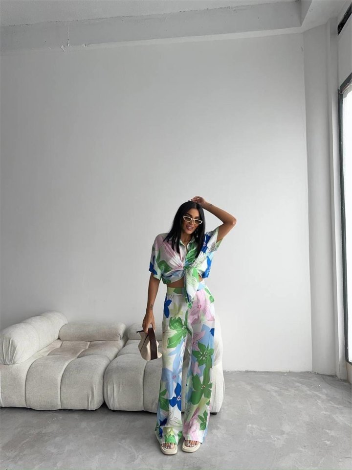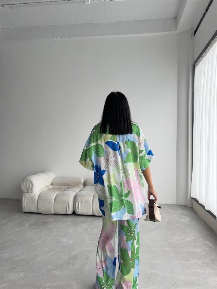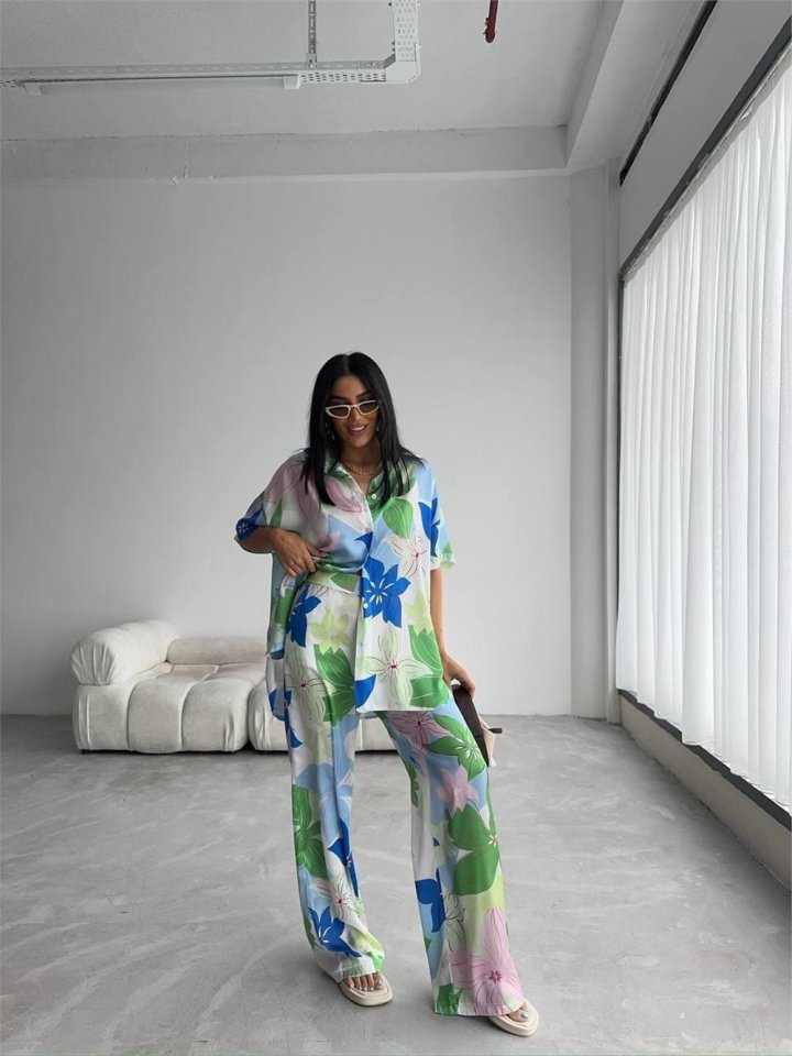 YEŞİL BÜYÜK ÇİÇEK DESEN SATEN GÖMLEK-PANTOLON TAKIM – Yeşil