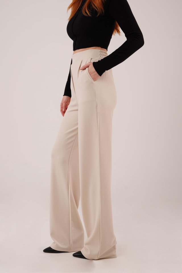 Yüksek Bel Bol Paça Krep Krem Pantolon