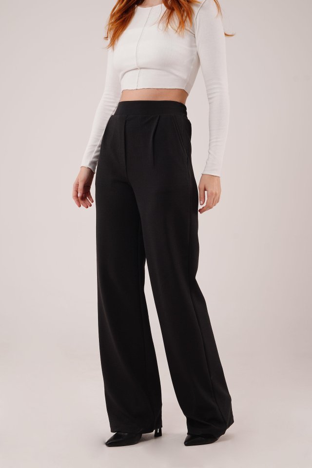 Yüksek Bel Bol Paça Krep Siyah Pantolon